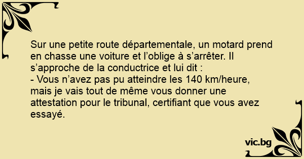 - Vous n’avez pas pu atteindre les 140 km/heure, mais je vais tout de même vous donner une attestation pour le tribunal, certifiant que vous avez essayé.