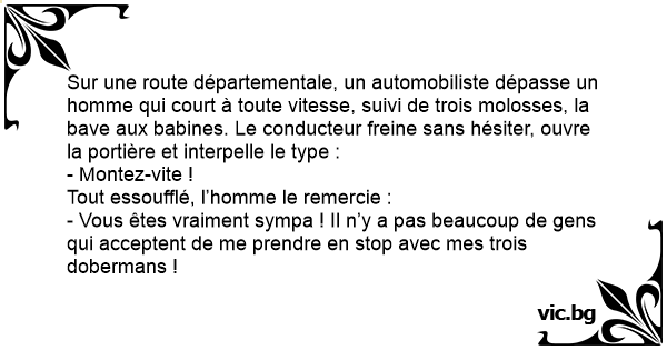 Sur une route départementale, un automobiliste dépasse un homme qui court à toute vitesse, suivi de trois molosses, la bave aux babines. Le conducteur freine sans hésiter, ouvre la portière et interpelle le type :