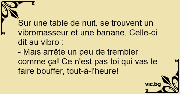 Een banaan en een vibrator liggen op het nachtkastje. De banaan vraagt aan de vibrator: 'Zeker jouw eerste keer, want je trilt zo'.