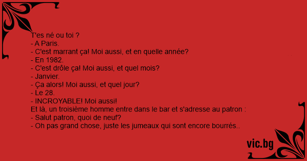 Deux hommes sont dans un bar et discutent : - Où est-ce que tu es né ? - A Tours... - Ah bon ! Moi aussi !! Et dans quelle maternité ? - Celle du beffroi... - Moi aussi !! Et quel jour ? -...