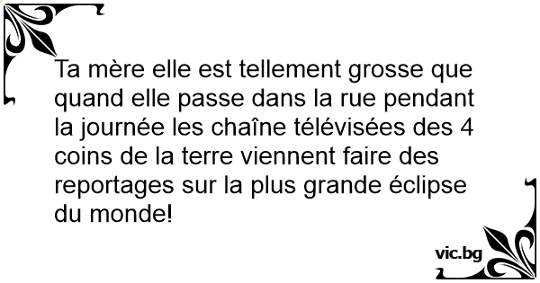 Ta mère elle est tellement grosse que quand elle passe dans la rue pendant la journée les chaîne télévisées des 4 coins de la terre viennent faire des reportages sur la plus grande éclipse du monde!