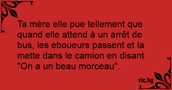 Ta mère elle pue tellement que quand elle attend à un arrêt de bus, les eboueurs passent et la mette dans le camion en disant "On a un beau morceau".