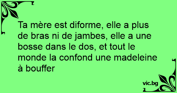 Ta mère est diforme, elle a plus de bras ni de jambes, elle a une bosse dans le dos, et tout le monde la confond une madeleine à bouffer