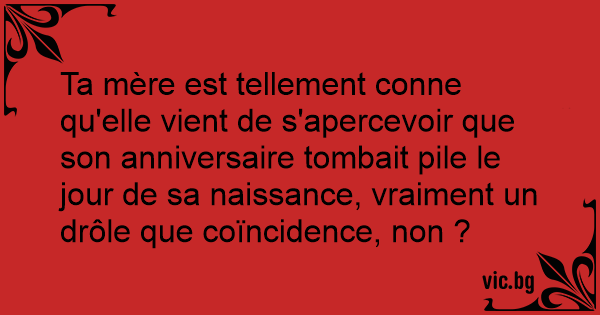 Ta mère est tellement conne qu'elle vient de s'apercevoir que son anniversaire tombait pile le jour de sa naissance, vraiment un drôle que coïncidence, non ?