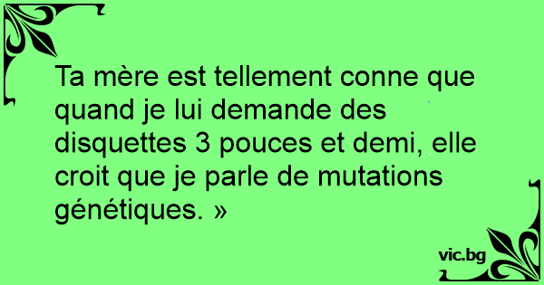 Ta mère est tellement conne que quand je lui demande des disquettes 3 pouces et demi, elle croit que je parle de mutations génétiques. »