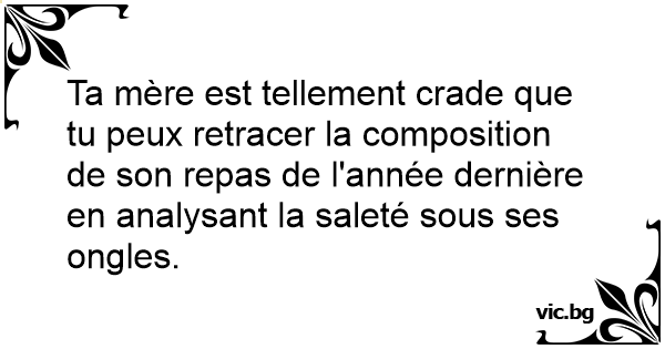 Ta mère est tellement crade que tu peux retracer la composition de son repas de l'année dernière en analysant la saleté sous ses ongles.