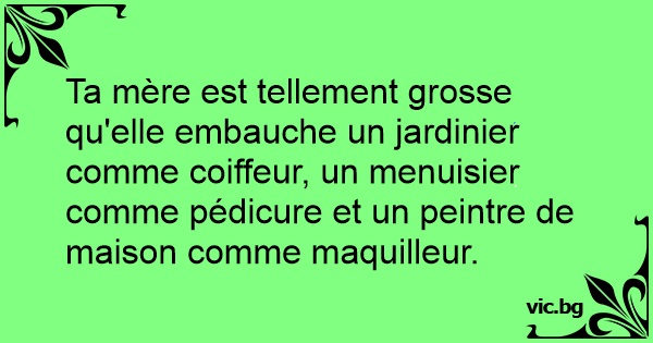 Ta mère est tellement grosse qu'elle embauche un jardinier comme coiffeur, un menuisier comme pédicure et un peintre de maison comme maquilleur.