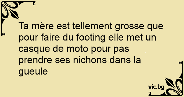 Ta mère est tellement grosse que pour faire du footing elle met un casque de moto pour pas prendre ses nichons dans la gueule