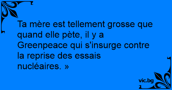 Ta mère est tellement grosse que quand elle pète, il y a Greenpeace qui s'insurge contre la reprise des essais nucléaires. »