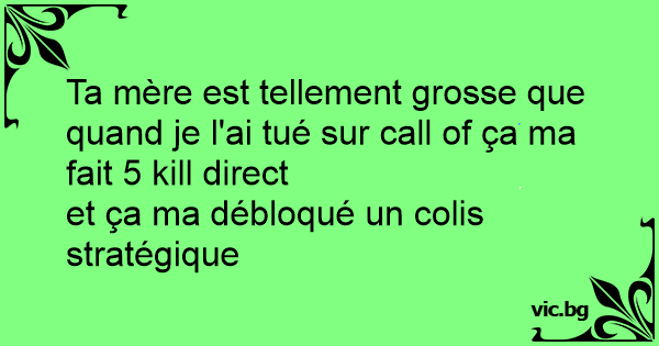 Ta mère est tellement grosse que quand je l'ai tué sur call of ça ma fait 5 кill direct et ça ma débloqué un colis stratégique