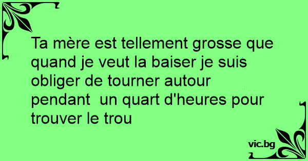 Ta mère est tellement grosse que quand je veut la baiser je suis obliger de tourner autour pendant un quart d'heures pour trouver le trou