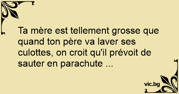 Ta mère est tellement grosse que quand ton père va laver ses culottes, on croit qu'il prévoit de sauter en parachute ...