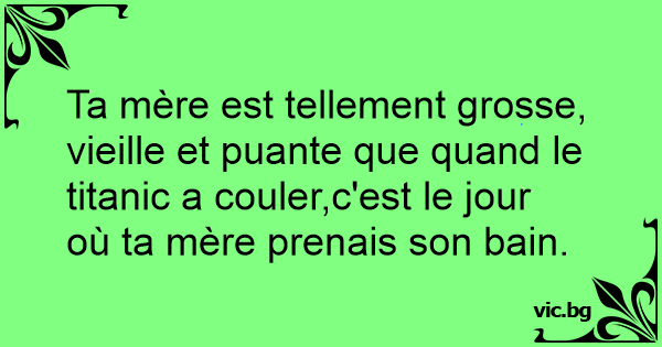 Ta mère est tellement grosse, vieille et puante que quand le titanic a couler,c'est le jour où ta mère prenais son bain.