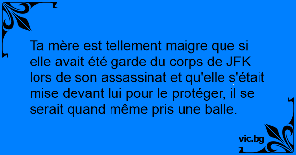 Ta mère est tellement maigre que si elle avait été garde du corps de JFK lors de son assassinat et qu'elle s'était mise devant lui pour le protéger, il se serait quand même pris une ваllе.