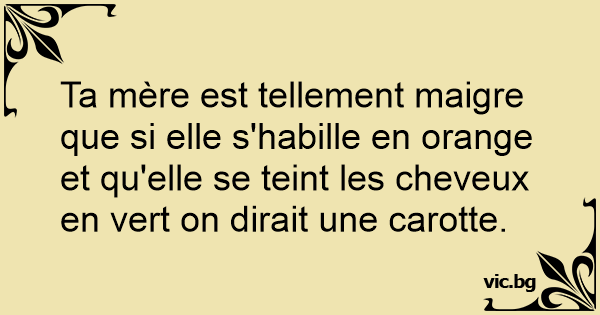 Ta mère est tellement maigre que si elle s'habille en orange et qu'elle se teint les cheveux en vert on dirait une carotte.