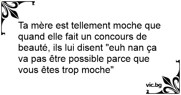 Ta mère est tellement moche que quand elle fait un concours de beauté, ils lui disent "euh nan ça va pas être possible parce que vous êtes trop moche"