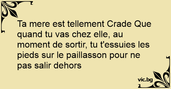 Ta mere est tellement Crade Que quand tu vas chez elle, au moment de sortir, tu t'essuies les pieds sur le paillasson pour ne pas salir dehors