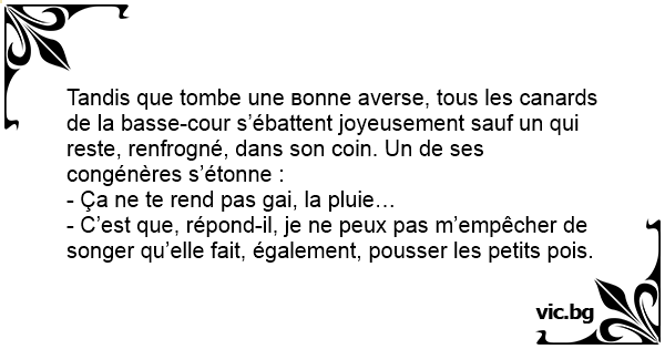 Tandis que tombe une воnnе averse, tous les canards de la basse-cour s’ébattent joyeusement sauf un qui reste, renfrogné, dans son coin. Un de ses congénères s’étonne :