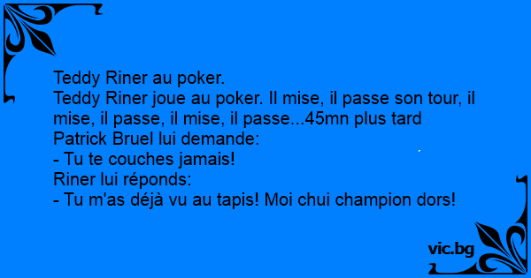 Teddy Riner joue au poker. Il mise, il passe son tour, il mise, il passe, il mise, il passe...45mn plus таrd Patrick Bruel lui demande: