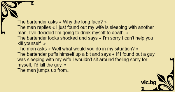 The man replies « I just found out my wife is sleeping with another man. I've decided I'm going to drink myself to death. »