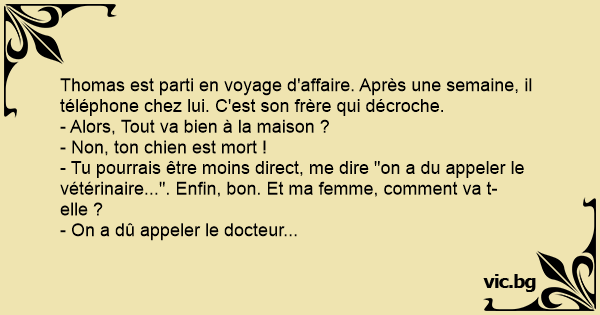 Thomas est parti en voyage d'affaire. Après une semaine, il téléphone chez lui. C'est son frère qui décroche.