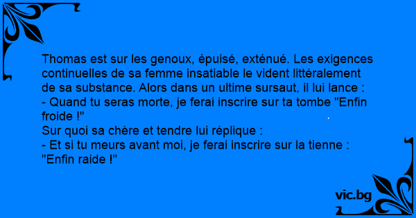 Thomas est sur les genoux, épuisé, exténué. Les exigences continuelles de sa femme insatiable le vident littéralement de sa substance. Alors dans un ultime sursaut, il lui lance :