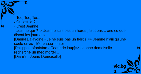 - Jeanne qui ?=> Jeanne suis pas un héros ; faut pas croire ce que disent les journaux…