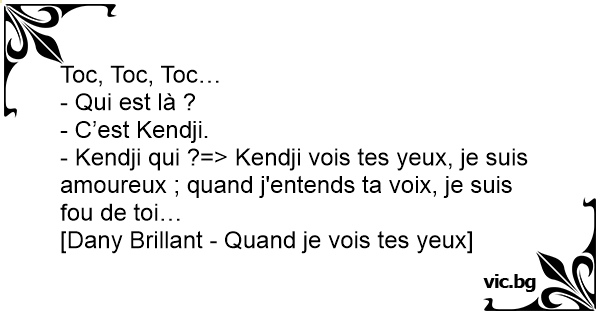 - Kendji qui ?=> Kendji vois tes yeux, je suis amoureux ; quand j'entends ta voix, je suis fou de toi…
