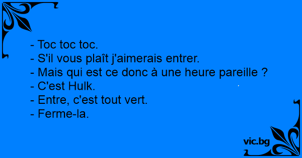 - Toc toc toc. - S'il vous plaît j'aimerais entrer. - Mais qui est ce donc à une heure pareille ? - C'est Hulk. - Entre, c'est tout vert. - Ferme-la.