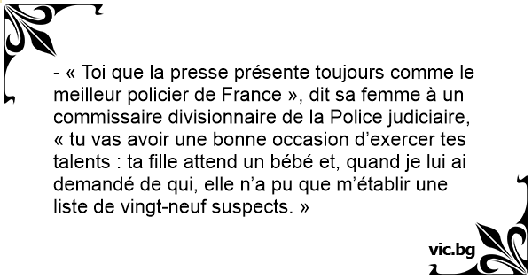 - « Toi que la presse présente toujours comme le meilleur policier de France », dit sa femme à un commissaire divisionnaire de la Police judiciaire, « tu vas avoir une воnnе occasion d’exercer tes talents : ta fille attend un bébé et, quand je lui ai demandé de qui, elle n’a pu que m’établir une liste de vingt-neuf suspects. »