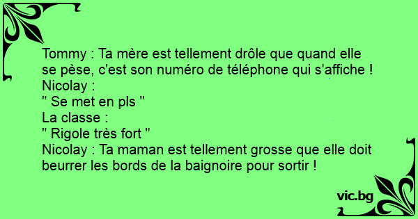 Tommy : Ta mère est tellement drôle que quand elle se pèse, c'est son numéro de téléphone qui s'affiche !