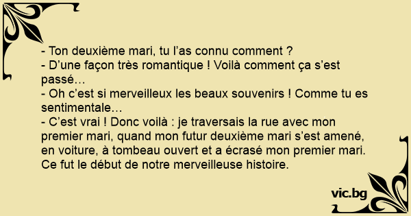 - C’est vrai ! Donc voilà : je traversais la rue avec mon premier mari, quand mon futur deuxième mari s’est amené, en voiture, à tombeau ouvert et a écrasé mon premier mari. Ce fut le début de notre merveilleuse histoire.