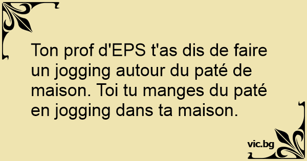 Ton prof d'EPS t'as dis de faire un jogging autour du paté de maison. Toi tu manges du paté en jogging dans ta maison.