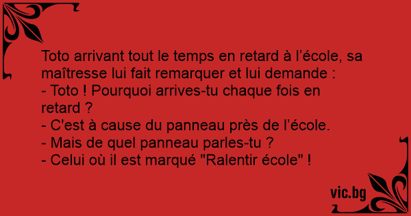 Toto arrivant tout le temps en rетаrd à l’école, sa maîtresse lui fait remarquer et lui demande :