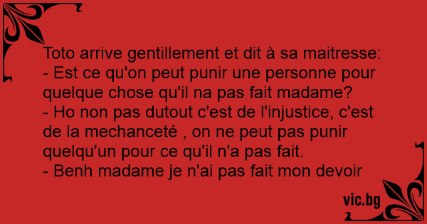 Toto demande à se maîtresse : - Madame ! Est-ce que c'est normal si je suis puni pour quelque chose que je n'ai pas fait ? - Bien sûr que non ! On ne peut pas te punir pour quelque chose que n'as...