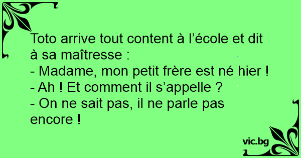 Toto arrive tout content à l’école et dit à sa maîtresse :