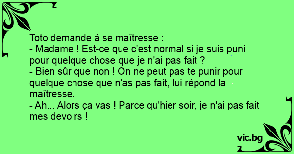 Η ΜΑΘΗΤΡΙΑ ΣΤΗΝ ΔΑΣΚΑΛΑ Η τιμωρία..... - Кажи Иванчо? Учителката само што влегува на час, а Зоки Поки веднаш крева рака. Иванчо към учителката: Little Johnny asks the teacher, “Mrs Roberts, can I be punished for something I haven’t done?” Student: "would you ever punish me for something I didn't do?" Toto se plaint à un ami, Pierino: "Signora maestra si puo' punire uno per una cosa che non ha fatto?". Un alunno di 5° elementare si alza in piedi non appena entra la maestra e le chiede: One day a boy came home running while crying. "Herr Lehrer," fragt Fritzchen den Klassenlehrer. "kann man für etwas bestraft werden, was man nicht getan hat?" PUPIL: "Would you punish me for something I did not do?" TEACHER:" Of course not." PUPIL: "Good, because I haven't done my homework." "Kann man für etwas bestraft werden was man gar nicht gemacht hat?", fragt Fritz den Lehrer. Lehrer antwortet: "Nein kann man nicht." Fritz: "Gut, ich hab nämlich meine Hausaufgabe nicht gemacht!" C'est une conversation entre une maîtresse d'école et Toto : Toto : - Madame, madame, est-ce que je peux être puni pour quelque chose que je n'ai pas fait ? La maîtresse : - Mais bien sur que non Toto, on ne va pas te punir pour quelque chose que tu n'as pas fait. Toto : - Eh bien, ça va alors...... Sınıfa yeni gelen öğrenci ikinci gün öğretmenine sorar " Öğretmenim insana yapmadığı bir şey için ceza verir misiniz ?" Öğretmeni "olur mu öyle şey evladım neden insana yapmadığı bir şey için ceza... Ma mère m'a puni pour une chose que je n'ai même pas faite. - Ah oui ! Pour quoi ? - Mes devoirs. Girl: “Mommy, today in school I was punished for something that I didn’t do.” Mother: “But that’s terrible! I’m going to have a talk with your teacher about this … by the way, what was it that you... - Fröken kan man få skäll för något man inte har gjort? - Nej, varför undrar du det Pelle? - Jag har inte gjort läxan! Det var en pojke som frågade sin fröken: - Fröken, kan man få skäll för nåt man inte har gort? - Nej, sa fröken. - Bra, för jag har inte gjort läxan!!! Joãozinho chega para a professora e pergunta: — Professora, alguém pode ser culpado por alguma coisa que não fez? — Mas é claro que não, Joãozinho! — Ufa! Eu não fiz o dever de casa. Jantje zat in de klas en vroeg aan de meester: "Meester, word je gestraft voor iets dat je niet gedaan hebt?" Waarop de meester antwoordde: "Natuurlijk niet Jantje, als je niets gedaan hebt, waarom... Hr. lærer, man må ikke straffe nogen, der ikke har lavet noget, vel, hr. lærer? Selvfølgelig ikke, Brian. Hvorfor kommer du dog på det? For jeg har ikke lavet min regneopgave! – Frøken, kan man bli straffet for noe man ikke har gjort? – Nei, Petter, det kan man ikke. – Puh, det var flaks, jeg har nemlig ikke gjort leksene. Toto arrive gentillement et dit à sa maitresse: - Est ce qu'on peut punir une personne pour quelque chose qu'il na pas fait madame? - Ho non pas dutout c'est de l'injustice, c'est de la mechanceté... Na začátku hodiny se přihlásil Pepíček: „Paní učitelko, mohu být potrestán za něco, co jsem neudělal?” „No, to v žádném případě, Pepíčku.” „Tak to mi spadl kámen ze srdce - já jsem totiž neudělal... - Apu, meg lehet büntetni valakit azért, amit nem csinált? - Nem, kisfiam. Mit nem csináltál? - Házi feladatot... En el colegio: - Señorita profesora, ¿verdad que no se debe castigar a un niño por una cosa que no haya hecho? - No, claro que no. - Estupendo, no he hecho los deberes. Ali o günkü derslerini hazırlamamıştı. Sınıfa öğretmenin girdiğini görünce parmağını kaldırır ve: - Öğretmenim bir insana yapmadığı bir şey için ceza verilir mi? - Verilmez oğlum. - O halde ben... Eleven till läraren: - Kan man få skäll för något man inte gjort ? Läraren: - Nej. Eleven: - Bra, för jag har inte gjort läxan ! Jantje vraagt aan de leraar: "Meneer, kan iemand ook gestraft worden voor iets wat dat hij niet gedaan heeft?" Leraar: "Nee, dat is niet eerlijk. Maar waarom vraag je dat?" Jantje: "Ik heb mijn... PepitO le dice a su profesora: Profe usted me castigaria por algo q yo nom ice...?¿ Y la profesora, con sierta risa le dice: No Pepito como crees que te voy a castigar por algo que no iciste... Y... Llega pepito a donde su maestra: - Maestra, ¿usted castigaria a un niño que no ha hecho nada? - Pues, no, no tendria porque hacerlo. ¿Pero porque preguntas Pepito? - Por nada, ahora sencillamente... Küçük kız okuldan gelir ve annesine: - Annecim,bugün okulda yapmadığım bir şey yüzünden cezalandırıldım. Annesi yüksek sesle: - Ama, bu nasıl olur? Okula gelip öğretmeninle bu konu hakkında...