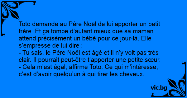 - Tu sais, le Père Noël est âgé et il n’y voit pas très clair. Il pourrait peut-être t’apporter une petite sœur.
