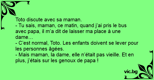 Toto dit à sa maman : - Tu sais, maman, aujourd'hui dans l'autobus, papa m'a demandé de me lever et de laisser ma place à une jeune et jolie dame. - Et tu l'as fait ? - Ben, oui. - C'est très...