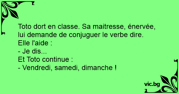 Toto dort en classe. Sa maitresse, énervée, lui demande de conjuguer le verbe dire.