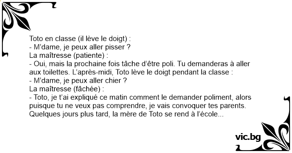 - Oui, mais la prochaine fois tâche d’être poli. Tu demanderas à aller aux toilettes. L’après-midi, Toto lève le doigt pendant la classe :
