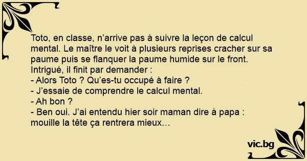 Toto, en classe, n’arrive pas à suivre la leçon de calcul mental. Le maître le voit à plusieurs reprises cracher sur sa paume puis se flanquer la paume humide sur le front. Intrigué, il finit par demander :