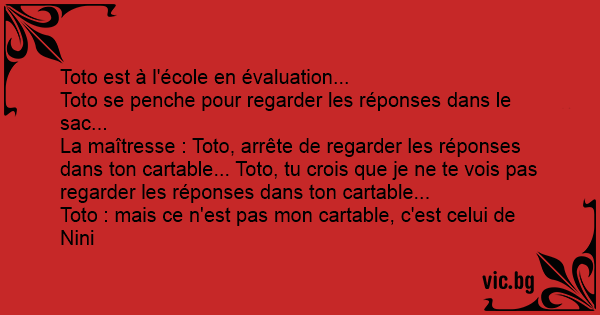 La maîtresse : Toto, arrête de regarder les réponses dans ton cartable... Toto, tu crois que je ne te vois pas regarder les réponses dans ton cartable...