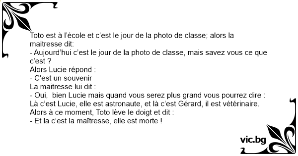Toto est à l’école et c’est le jour de la photo de classe; alors la maitresse dit: