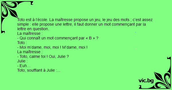 Toto est à l’école. La maîtresse propose un jeu, le jeu des mots ; c’est assez simple : elle propose une lettre, il faut donner un mot commençant par la lettre en question.