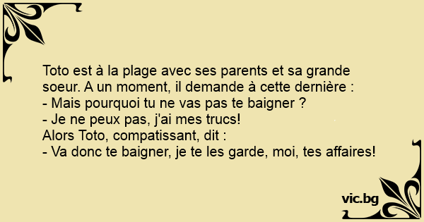 Toto est à la plage avec ses parents et sa grande soeur. A un moment, il demande à cette dernière :
