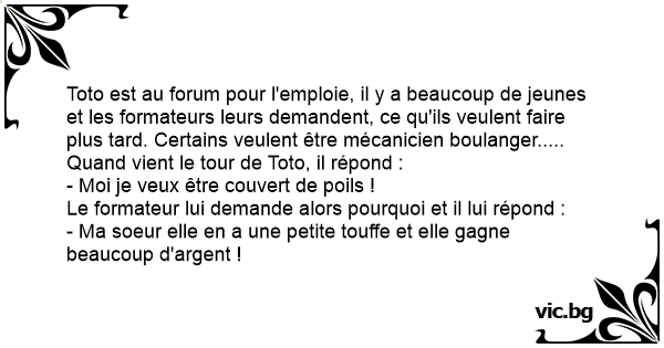 Toto est au forum pour l'emploie, il y a beaucoup de jeunes et les formateurs leurs demandent, ce qu'ils veulent faire plus таrd. Certains veulent être mécanicien boulanger..... Quand vient le tour de Toto, il répond :