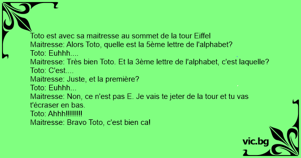Maitresse: Très bien Toto. Et la 3ème lettre de l'alphabet, c'est laquelle?
