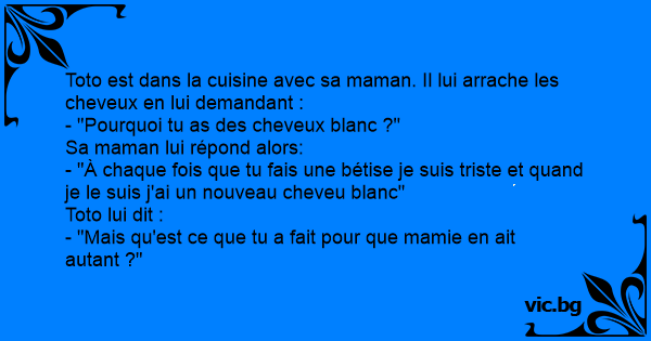 Toto demande à sa mère. - Maman sa fais quoi d'avoir un cheveu blanc ? - Et bien tu vois mon chérie a chaque fois que tu fais une bêtise j'en ai un de plus. - Et que ce que ta fais a mamie pour...