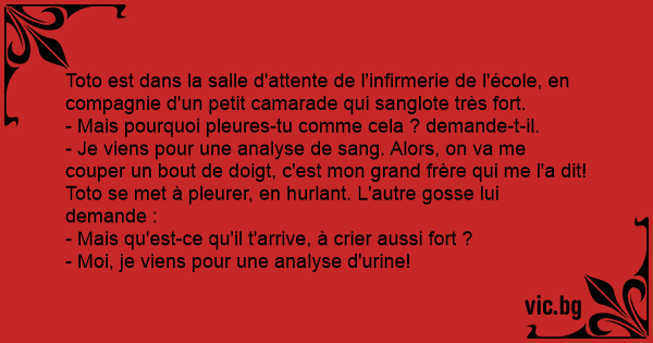 Toto va chez le médecin et voit une fille qui pleure: - Pourquoi tu pleures. - Parce que je vais faire une analyse de sang. - Tu pleure pour sa? - Mon frêre m'a dit que pour faire une analyse de...